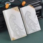 1号 重量:18.101克,规格:43mm*23mm*7mm【长*宽*厚】,有棉,色润白,油润细腻,手感温润,肉内散见棉,正面右上角及底部覆黄皮,皮色清新亮丽。此件浮雕一猛虎立于山石之上,一前爪抬起,回首后望,张嘴咆哮,威猛无比。虎啸寓意增添祥瑞。鉴定证号:AA77272(中证),价格为3999元,不打折。