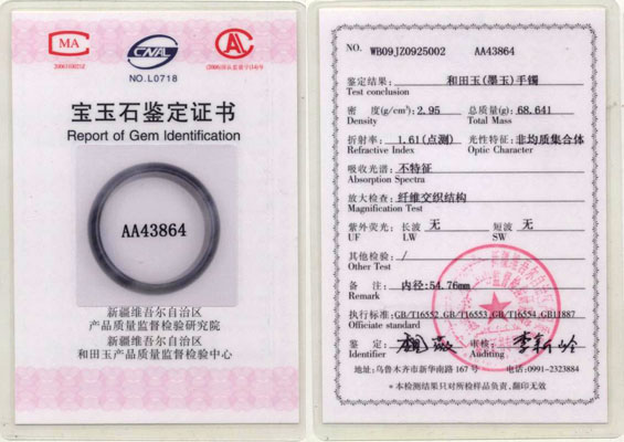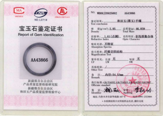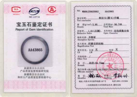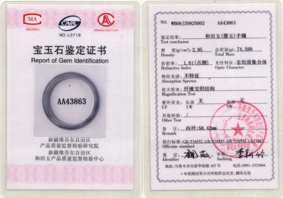 5号:重77.110克,规格:58.5*72*21.5【内径*外径*镯面宽,单位毫米】色墨,浓淡相间,内含墨点,不均匀分布,油润光洁,手感爽滑,内含四条水线。鉴定卡号:AA43867(已售)什么是“CMA”鉴定证书?