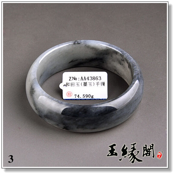 3号:重74.590克,规格:58.5*73*21【内径*外径*镯面宽,单位毫米】色墨,浓淡相间相融,内含墨点,呈云雾状不均匀分布,油润光洁,手感爽滑,局部偶见细棉。鉴定卡号:AA43863(已售)