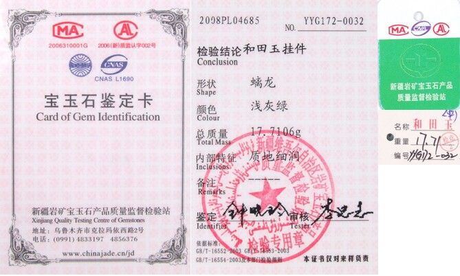 1号白玉重17.71克,外径33,厚12.5,单位毫米,色润白见青,成色均匀,质地较细腻,油度佳。鉴定卡号:YYG172-032