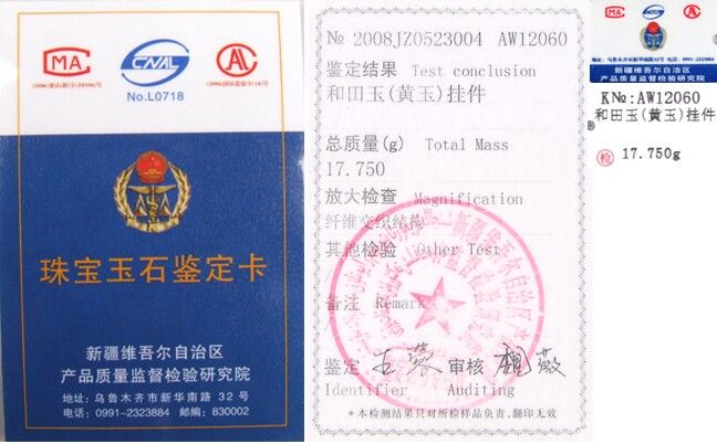 2号黄玉重17.750克,外径30.5,厚14,单位毫米,色嫩黄,成色均匀,质地较细腻,油度佳,内含极细微绺。鉴定卡号:AW12060