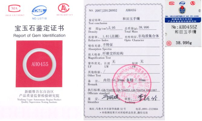 3号重38.996克,68.5*54*7(外径*内径*镯厚,单位毫米)色白中见青,局部带浅淡糖色,色泽清新含蓄,内环隐有极细微棉点。鉴定卡号:AH0455 (已售)