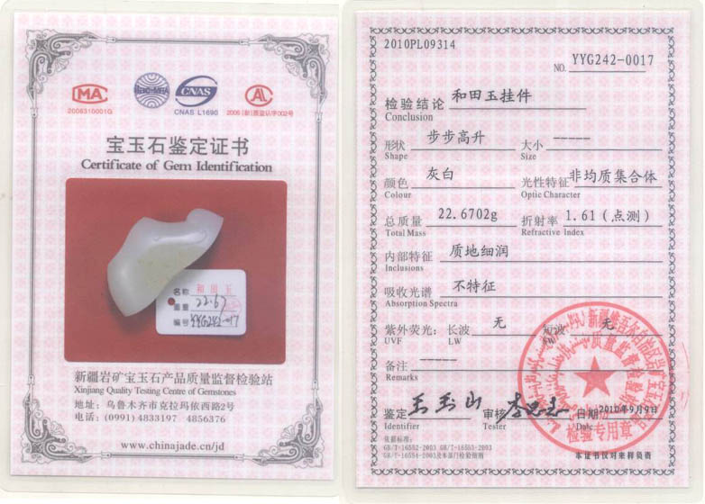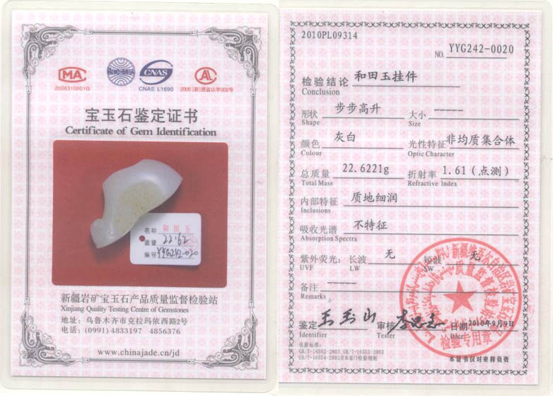 1.编号:ZBG10-09-165,重量:22.67克,规格:43.5mm*14.5mm*21.1mm【长*宽*厚】,鉴定证号:YYG242-017(大证)